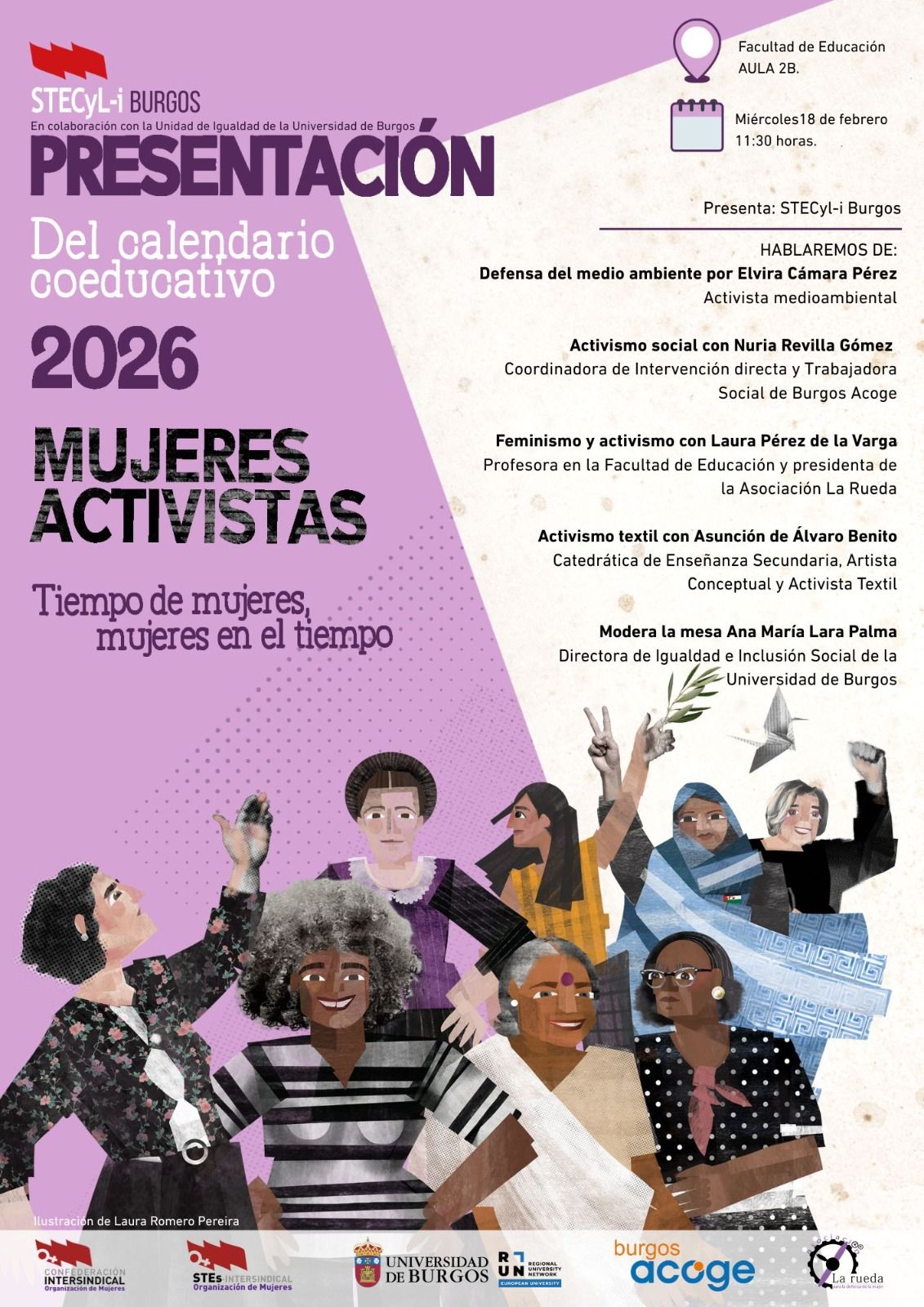 Presentación del Calendario Coeducativo 2026 Mujeres activistas. Tiempo de mujeres, mujeres en el tiempo, en colaboración con la Unidad de Igualdad de la Universidad de Burgos Facultad de Educación UBU Aula 2B Av. Vena...