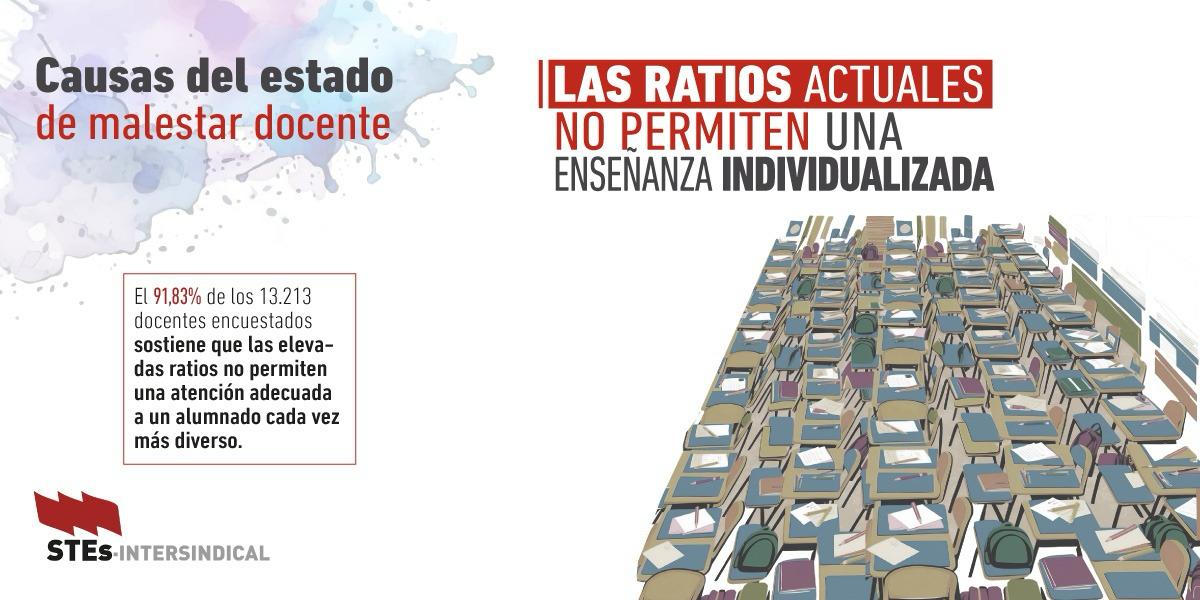 El 91,83% de los 13.213 docentes encuestados por STEs-i en todo el Estado sostiene que las elevadas ratios en el aula no permiten una atención adecuada a un alumnado cada vez más diverso. El...