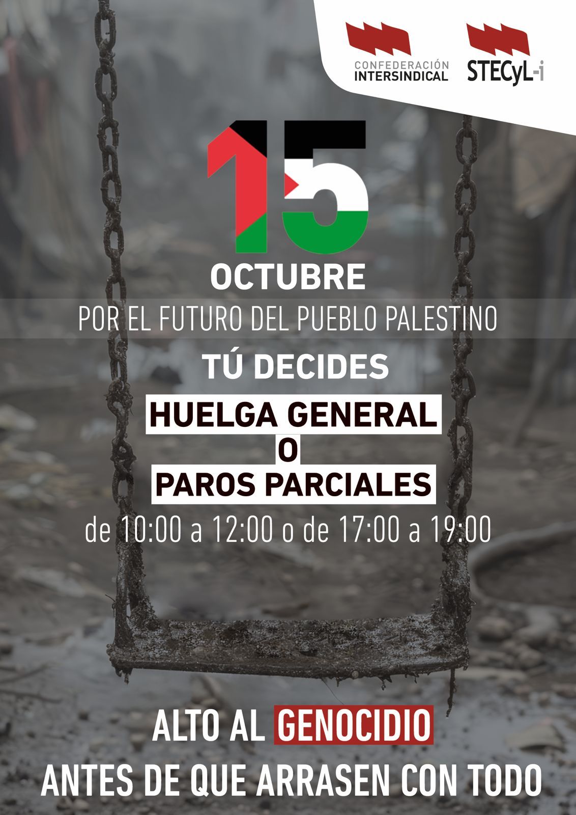 STECyL-i convoca paros parciales de dos horas el miércoles 15 de octubre en apoyo al pueblo palestino y exigiendo el final del genocidio que el Estado israelí está perpetrando en Gaza. Por otro lado, la Confederación Intersindical, de la que forma parte STECyL-i, ha convocado huelga de 24 horas en todos los sectores y en todo el país. En consecuencia, el día 15, el profesorado castellano y leonés dispondrá de dos modalidades de huelga (parcial de dos horas o de jornada completa).