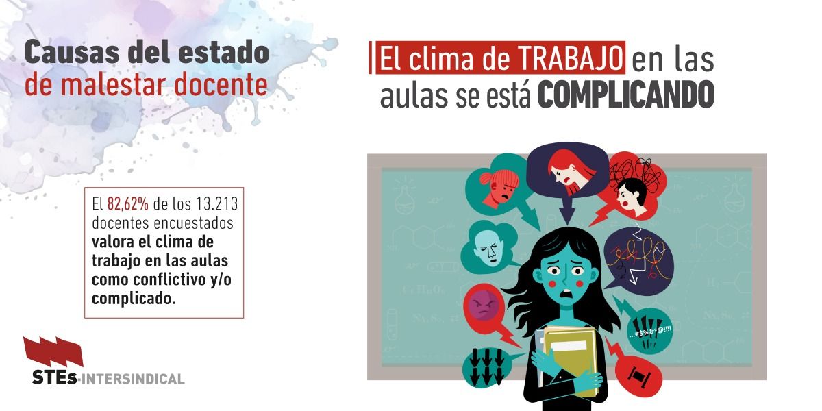 El 82,62% de los 13.213 docentes encuestados por STEs-i en todo el Estado valora el clima de trabajo en las aulas como conflictivo y/o complicado. https://stecyl.net/wp-content/uploads/2026/02/video-stes-23-feb.mp4 El 83,15% percibe un incremento de las agresiones...