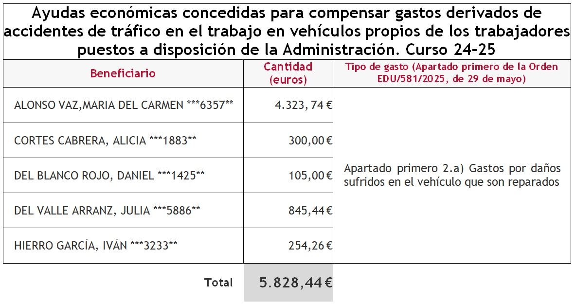 Se conceden 5 ayudas por un importe de 5.828,44 € y se deniegan 18. Las ayudas son para compensar gastos, pero no cubren los gastos totales del vehículo en los accidentes sufridos por los docentes que ponen su vehículo a disposición de la Administración.