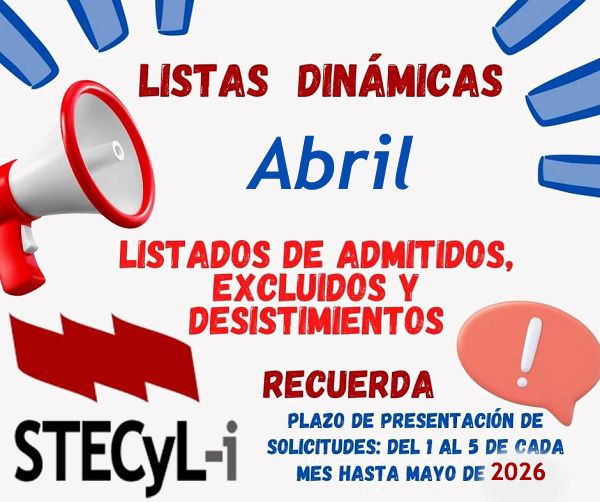 Resolución de 14 de abril de 2026, de la Dirección General de Recursos Humanos (259.9 KB) (3 páginas) da publicidad a la relación de personas aspirantes admitidas y excluidas en las listas extraordinarias dinámicas al desempeño de puestos docentes en régimen de interinidad en centros docentes públicos de enseñanzas no universitarias de la Comunidad de Castilla y León, durante el curso escolar 2025/2026, en el plazo habilitado en el mes de abril.