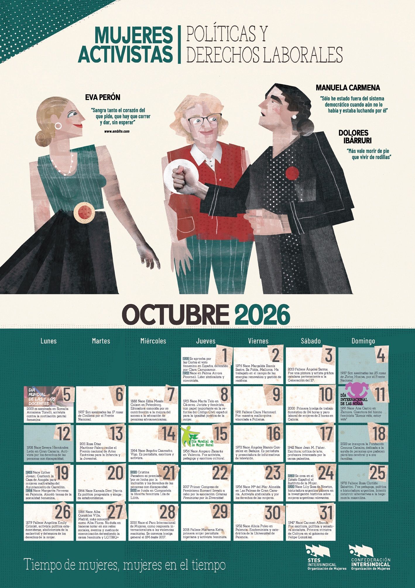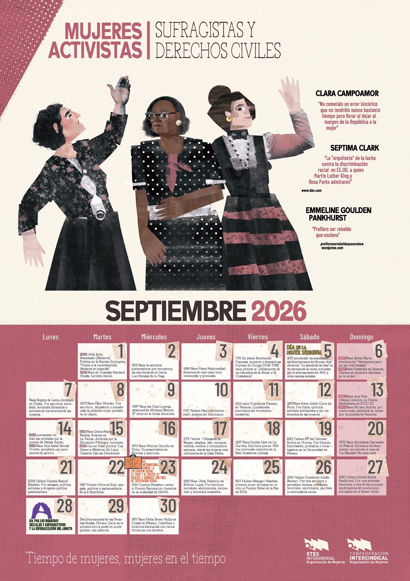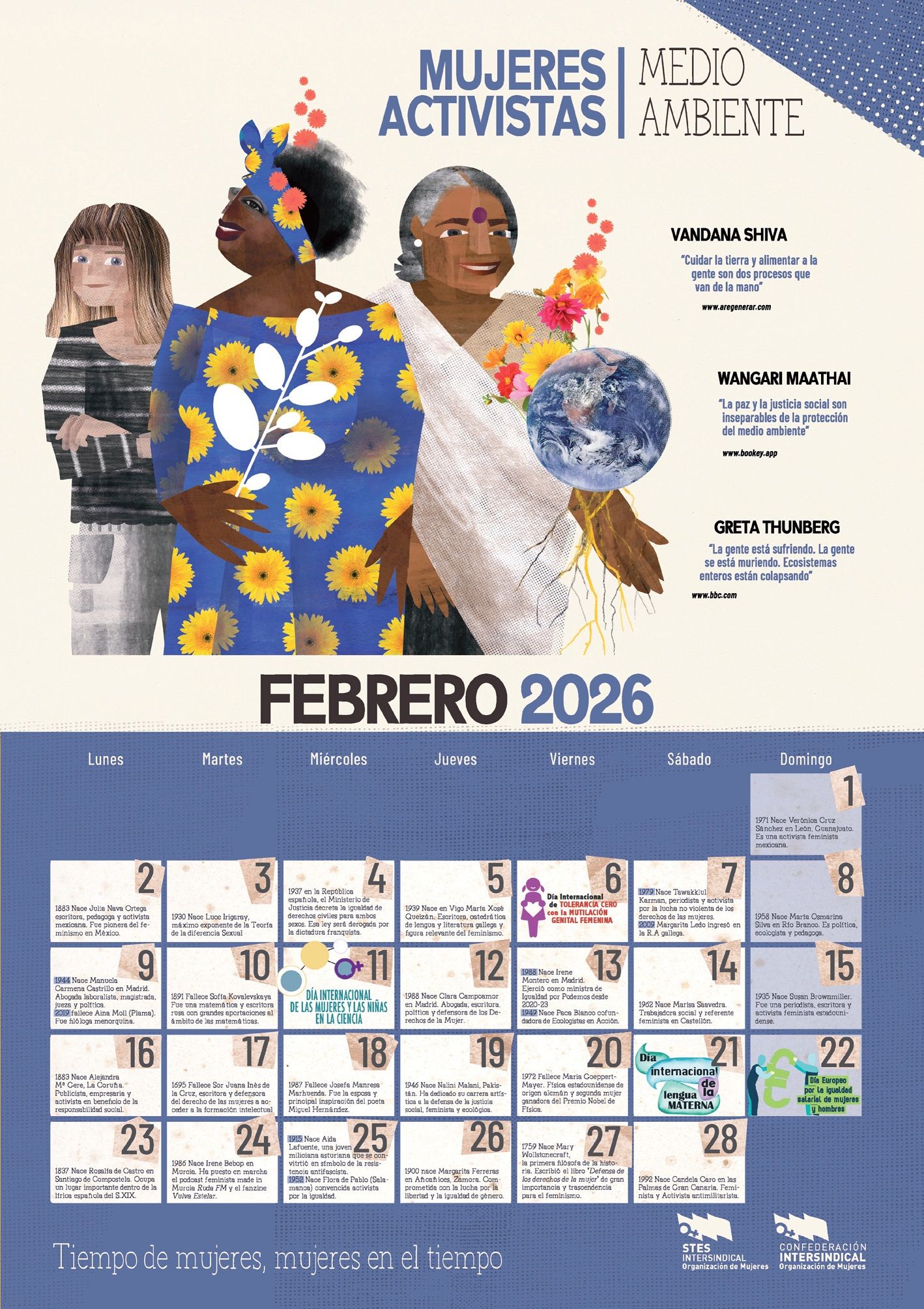 La Organización de Mujeres de STEs-intersindical y de la Confederación Intersindical presentan la edición para el año 2026 de su Calendario didáctico y coeducativo Tiempo de Mujeres, Mujeres en el Tiempo 2026, este año está dedicado a Mujeres activistas.