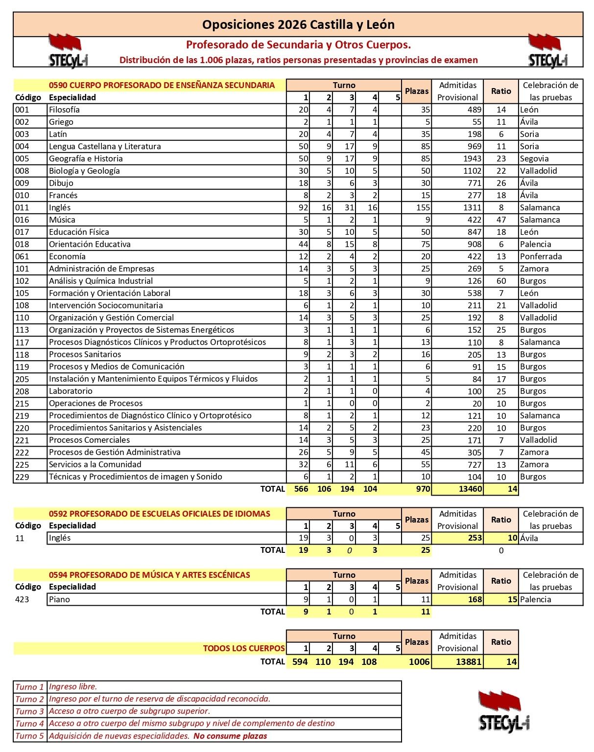 Castilla y León | Convocatoria Oposiciones 2026. Plazas: Secundaria 970, EO Idiomas 25, Conservatorios 11. Listado PROVISIONAL admitidos-excluidos. RATIO PLAZAS