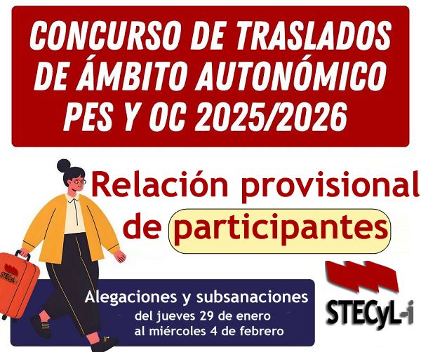 LaResolución de 28 de enero de 2026, de la Dirección General de Recursos Humanos (221.7 KB) (2 páginas) aprueba los listados provisionales de participantes y su puntuación en el concurso de traslados de ámbito autonómico entre el personal funcionario de carrera y en prácticas dependiente de la Administración de la Comunidad de Castilla y León y perteneciente a los cuerpos de catedráticos y profesores de enseñanza secundaria, profesores técnicos de formación profesional a extinguir, profesores especialistas en sectores singulares de formación profesional, catedráticos y profesores de escuelas oficiales de idiomas, catedráticos y profesores de música y artes escénicas, catedráticos y profesores de artes plásticas y diseño, maestros de taller de artes plásticas y diseño, e inspectores de educación, para la provisión de plazas en la Comunidad de Castilla y León, convocado por la Orden EDU/1197/2025, de 22 de octubre