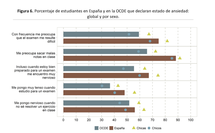 Porcentaje de estudiantes en España y en la OCDE que declaran estado de ansiedad: global y por sexo. Resultados de PISA 2015: El Bienestar de los estudiantes. MECD