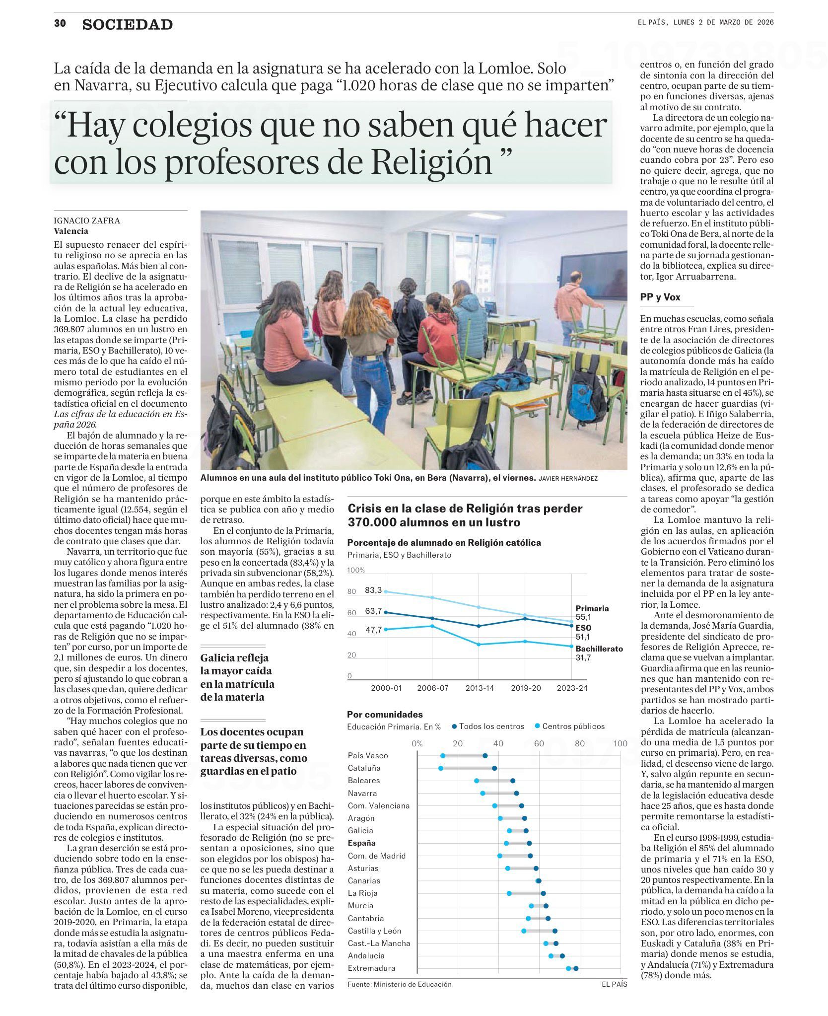 El declive de la asignatura de Religión se ha acelerado en los últimos años. La clase ha perdido 369.807 alumnos en un lustro y muchos docentes tienen más horas de contrato que clases que dar. “Hay colegios que no saben qué hacer con los profesores”