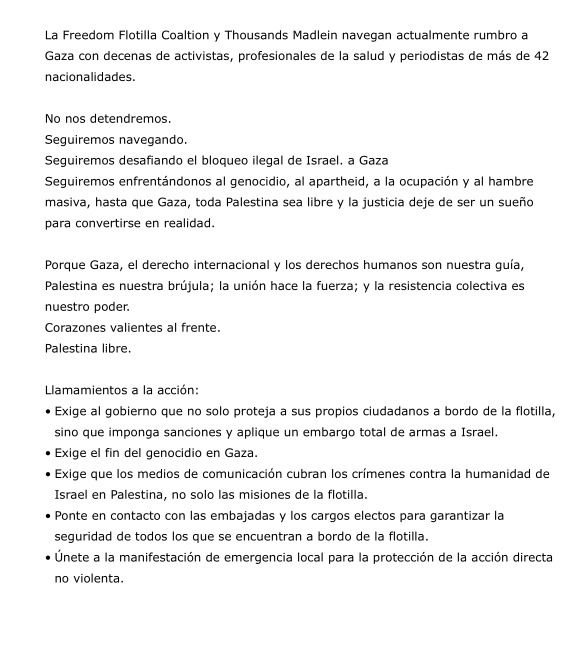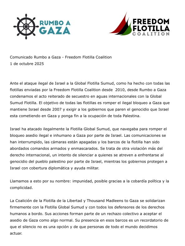 La Global Sumud Flotilla tenía como objetivo llevar ayuda humanitaria y romper el bloqueo criminal que Israel impone sobre Gaza, que constituye una flagrante violación del derecho internacional y de los derechos humanos más elementales. La acción militar contra esta misión pacífica, formada por personas solidarias de todo el mundo, evidencia una vez más la política de represión, apartheid y violencia sistemática que Israel ejerce contra el pueblo palestino.