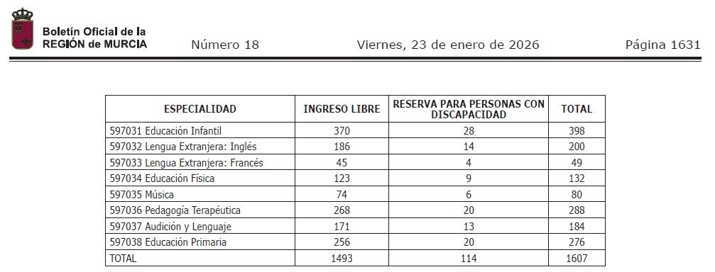 Murcia | Convocatoria Oposiciones 2026. Cuerpo Maestros-as: 8 especialidades, 1607 plazas Publicada 23 enero, 2026 · Actualizado 11 febrero, 2026 Plazo de inscripción: Del 26 de enero al 16 de febrero (a las 13:00h) Oposiciones para el ingreso en el Cuerpo de Maestros de la Administración Regional (código 843) (SIA 206897) Orden de 21 de enero de 2026 por la que se establecen las bases reguladoras y la convocatoria de los procedimientos selectivos para el ingreso y adquisición de nuevas especialidades en el Cuerpo de Maestros, a celebrar en el año 2026, y la elaboración de la lista de interinos para el curso 2026-2027, en el ámbito de gestión de la Comunidad Autónoma de la Región de Murcia. VER ANUNCIO Descargar TXT Descargar PDF (141 página/s – 2060.74KB)