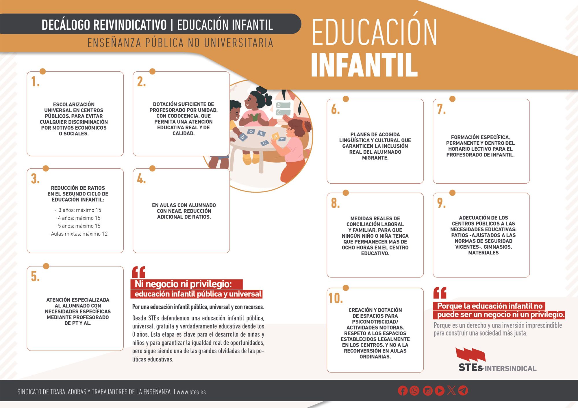 Desde STEs defendemos una educación infantil pública, universal, gratuita y verdaderamente educativa desde los 0 años. Esta etapa es clave para el desarrollo de niñas y niños y para garantizar la igualdad real de oportunidades, pero sigue siendo una de las grandes olvidadas de las políticas educativas.