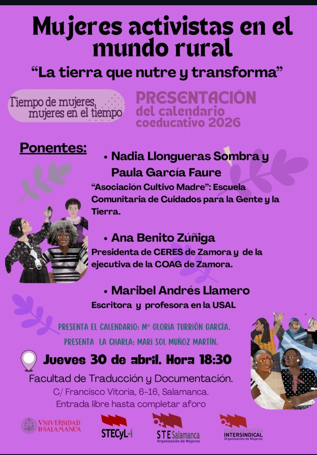 La Organización de Mujeres del STE Salamanca quiere informarles de la Charla que se hará a propósito del calendario “Tiempo de mujeres, mujeres en el tiempo”, este año el tema es “Mujeres activistas en el mundo rural”. Será el próximo jueves, 30 de abril, víspera del Día Internacional del Trabajo, a las 18:30 horas, en la Facultad de Traducción y Documentación (C/ Francisco Vitoria, 6 – 16).