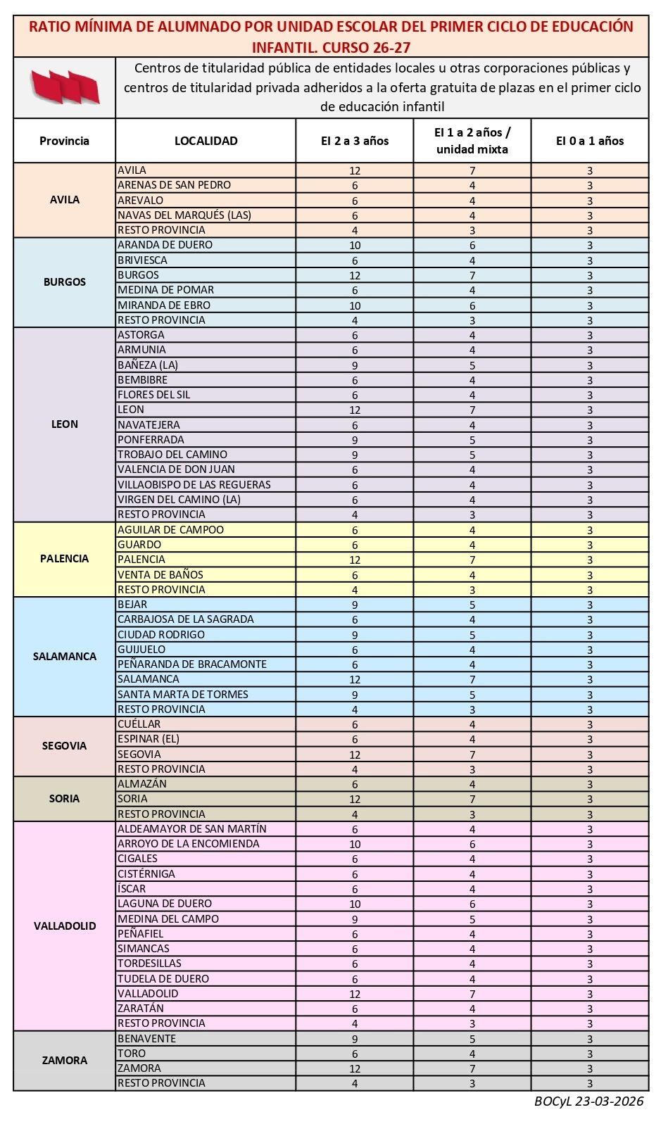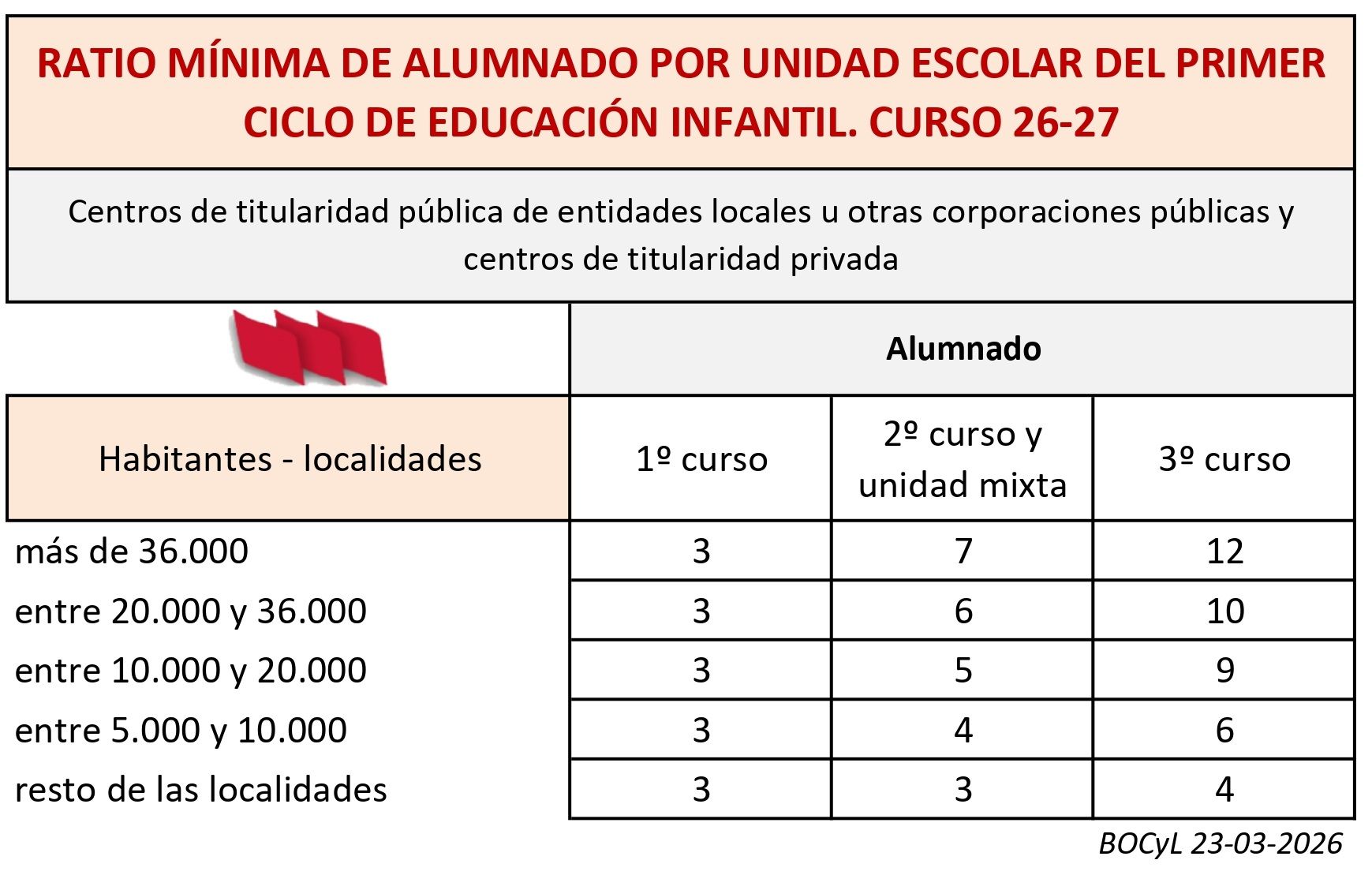 RESOLUCIÓN de 9 de marzo de 2026, de la Dirección General de Centros e Infraestructuras, por la que se determina la ratio mínima de alumnado por unidad escolar en los centros de titularidad pública de entidades locales u otras corporaciones públicas y centros de titularidad privada adheridos a la oferta gratuita de plazas en el primer ciclo de educación infantil, para el curso escolar 2026-2027 en la Comunidad de Castilla y León.