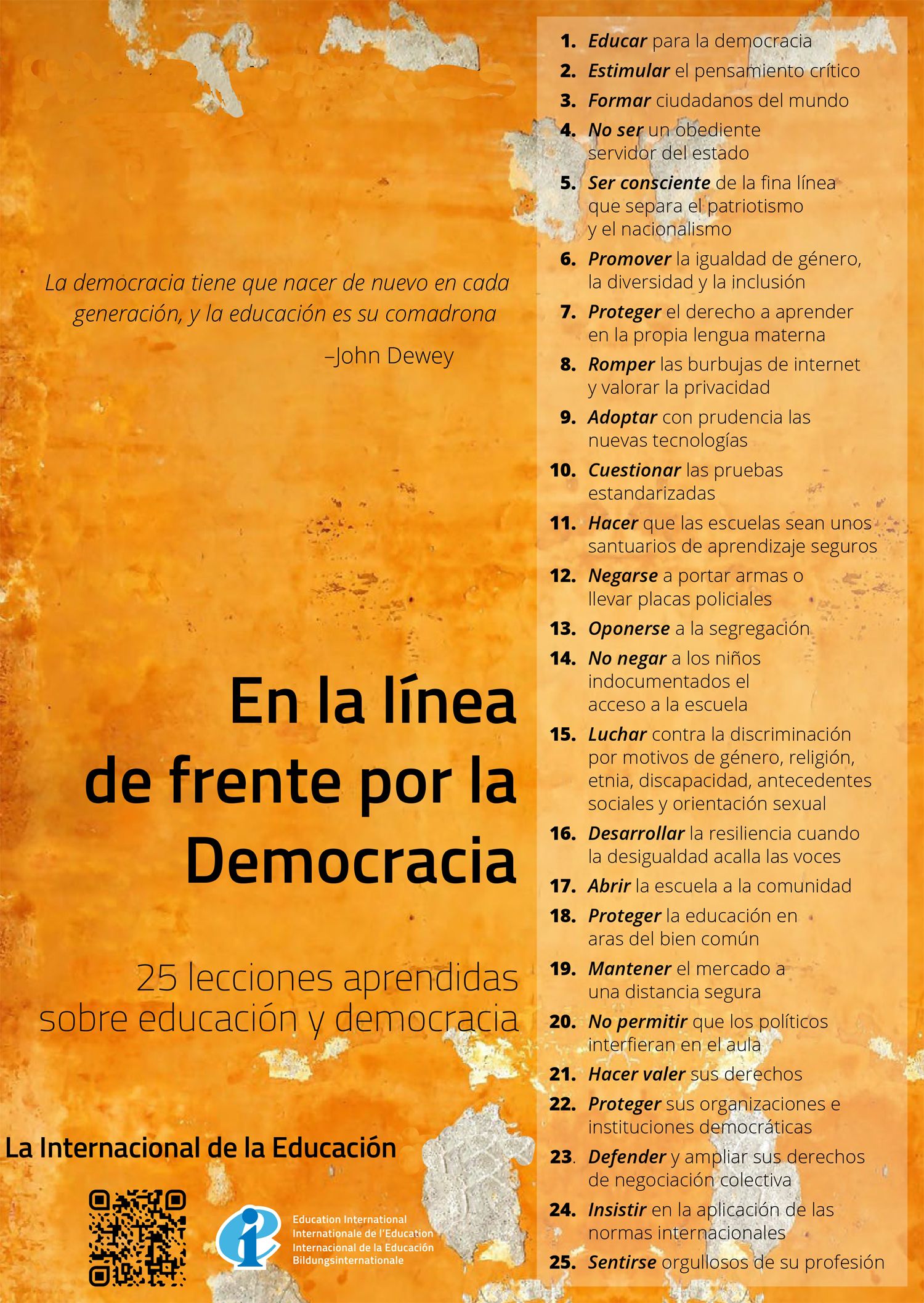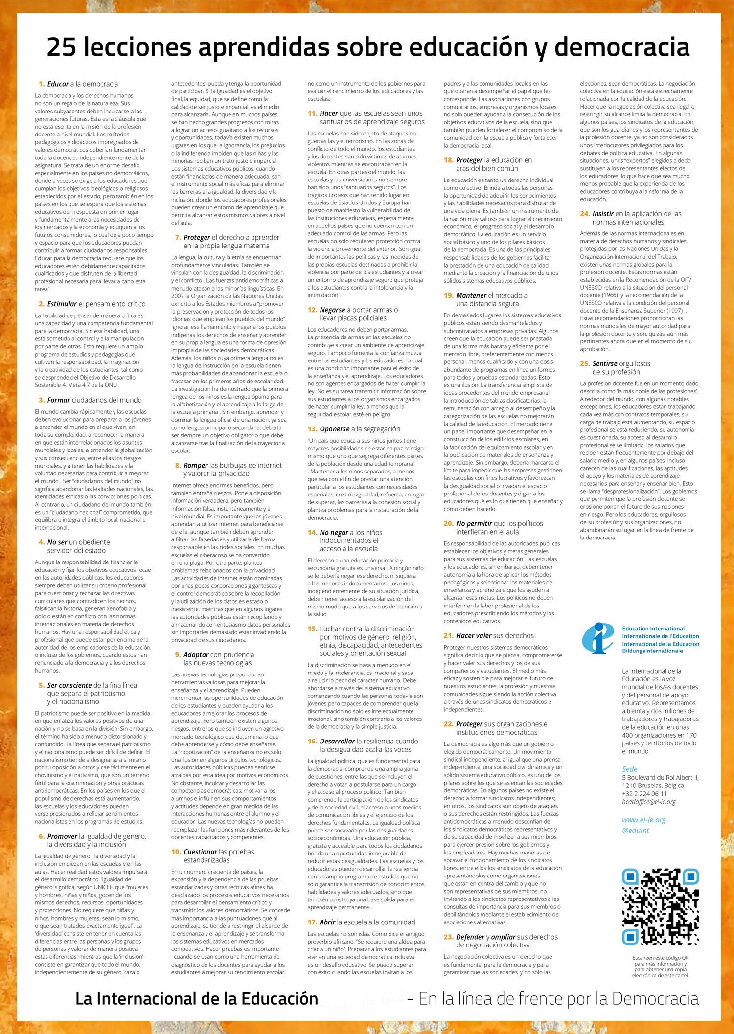 Es necesario seguir dando prioridad a los valores democráticos y a «adoptar una posición firme cuando y donde la democracia está en riesgo, a iniciar debates, a tomar medidas y a considerar qué pueden hacer las escuelas, las universidades y los sindicatos de la educación para lograr un futuro democrático sustentable para todos y para todas».
