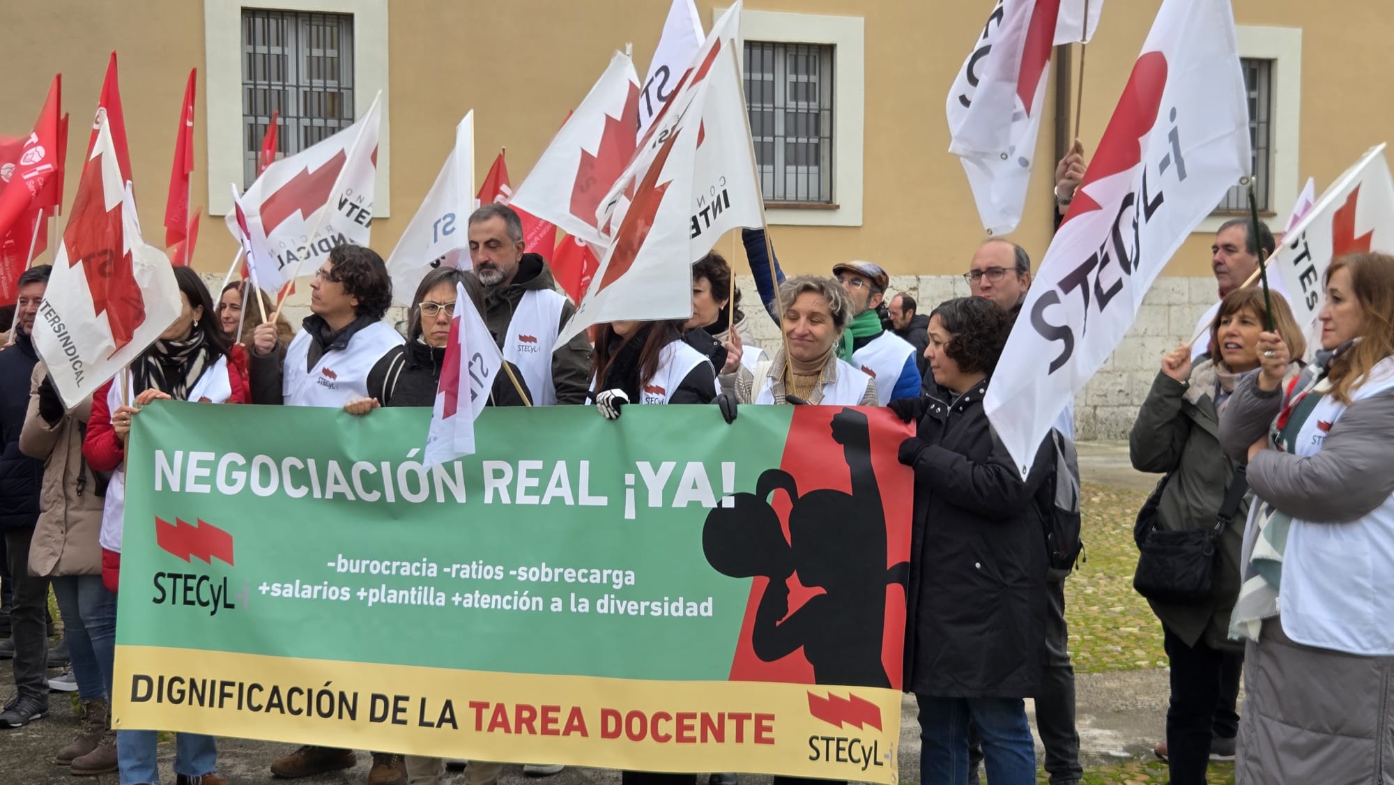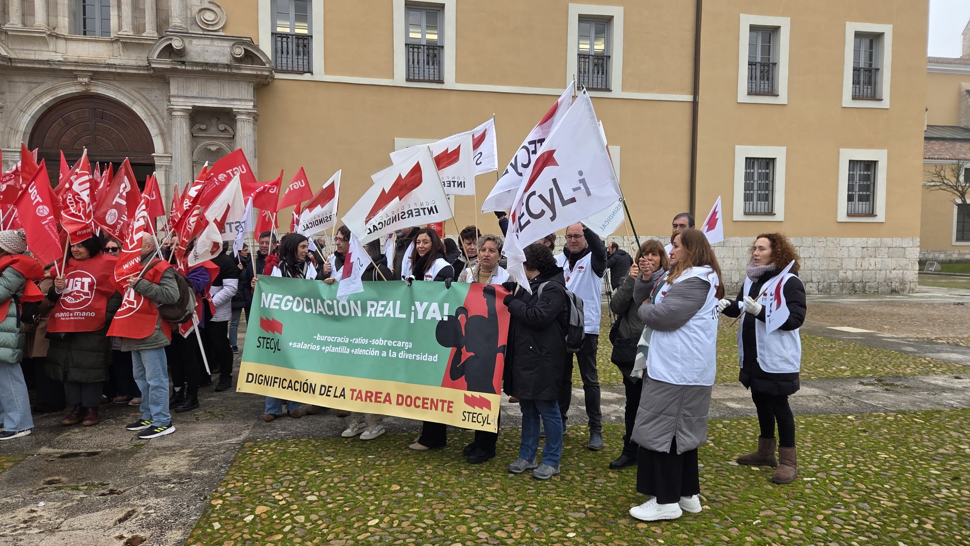 El sindicato de Trabajadoras y Trabajadores de la Enseñanza de Castilla y León (STECyL-i) se concentra ante la Consejería de Educación para exigir avances reales y compromiso financiero.
